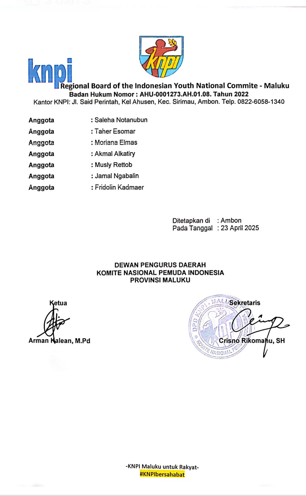 “Sebagai informasi, hari ini KNPI dinakhodai beta sebagai ketua, Farida Renhoran sebagai sekretaris, dan Elvira Betaubun sebagai bendahara. Mungkin itu yang bisa beta sampaikan ke teman-teman pers sekalian. Nanti beta berikan nama-nama lengkap kepengurusan untuk sinergitas selanjutnya,” harapnya.