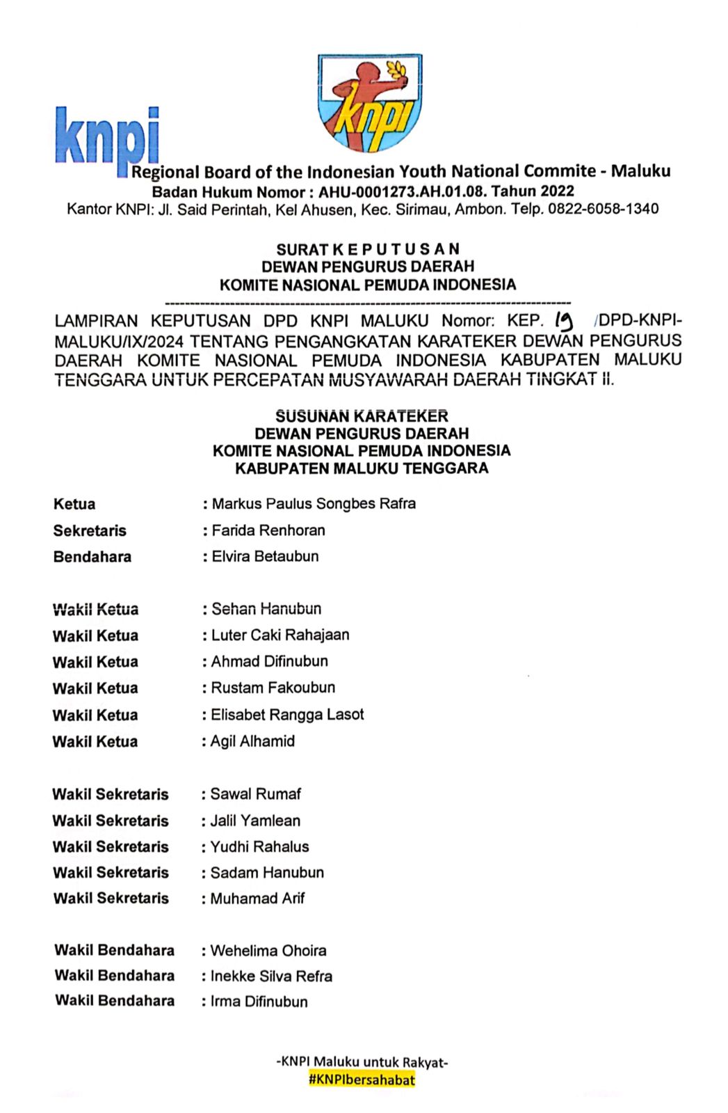 Markus Rafra, yang akrab disapa Pablo, menyampaikan bahwa dirinya telah menerima Surat Keputusan (SK) penetapan kepengurusan dari Dewan Pengurus Daerah (DPD) KNPI Provinsi Maluku.