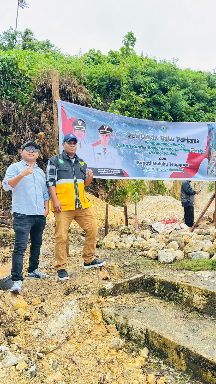 Ketua DPD Komite Nasional Pemuda Indonesia (KNPI) Maluku Tenggara, Pablo Rafra, bersama Sekretaris Dinas Perumahan dan Kawasan Permukiman (Perkim) Kabupaten Maluku Tenggara, Lone Madubun, meninjau langsung proses awal pembangunan rumah bagi warga terdampak konflik sosial dan bencana alam di Ohoi Weduar.