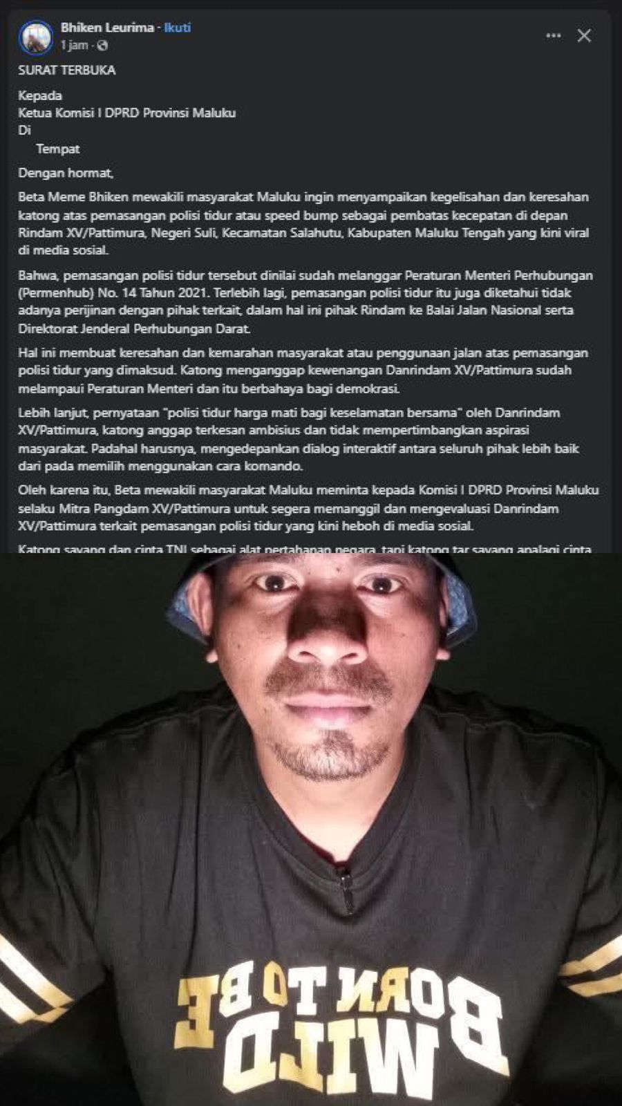 Unggahan surat terbuka seorang warga Maluku, Bhiken Leurima, di media sosial Facebook pada Rabu (22/10/2025), menjadi sorotan publik setelah menyinggung kebijakan pemasangan polisi tidur di depan Rindam XV/Pattimura, Negeri Suli, Kecamatan Salahutu, Kabupaten Maluku Tengah.